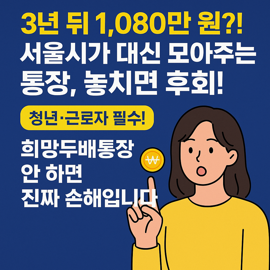 - 월 15만 원 저축 → 서울시 15만 원 매칭 → 총 1,080만 원 수령 가능 (3년 기준)